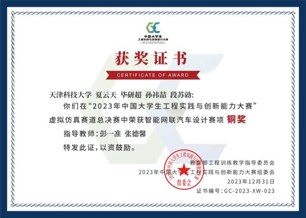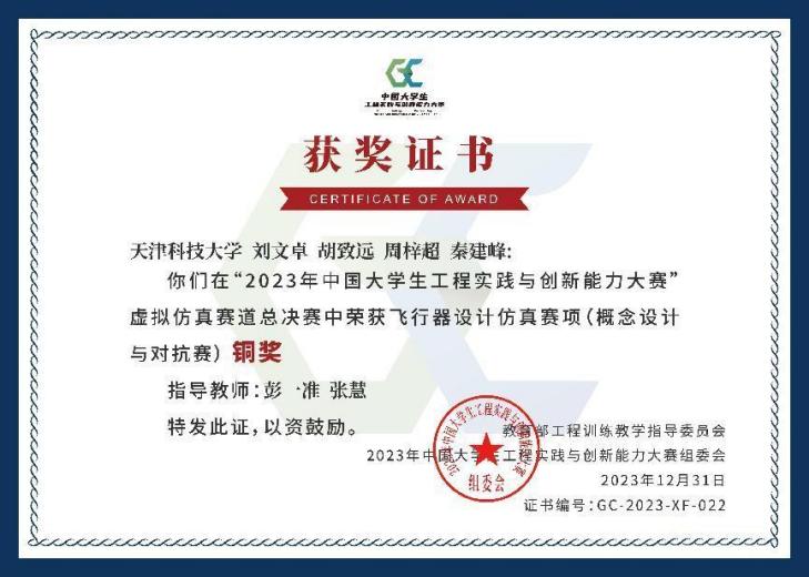 2023年中国大学生工程实践与创新能力大赛总决赛于2023年11月24日至2023年12月10日,分别在西北工业大学、中南大学、吉林大学、北京航空航天大学、深圳大学和山东大学举行。我校共5支队伍分别入围到本次总决赛的五个赛项,我校学子披荆斩棘、勇创佳绩,共获得2项国家级银奖和3项国家级铜奖的好成绩,为天津赛区进入总决赛项目最多、获奖学生最多的高校。